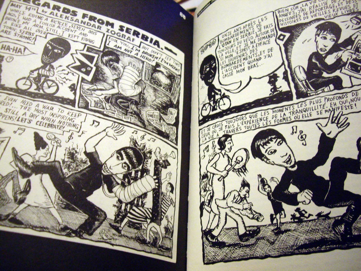 As part of the 20th Cellebration of the infamous French independent comics publisher L'Association's, their collaborators, including Zograf, were invited to create a page of a comic which would be a comment on one of their older works. Both original and brand new pages by authors were exhibited in Sierre, Switzerland, in early June, and reprinted in the book titled XX/MMX, which includes works by JC Menu, Julie Doucet, Marjane Satrapi, Placid, Kiki & Loulou Picasso, Balnquet and many more. Zograf commented on his own REGARDS FROM SERBIA page, originally published in Bons Baisers de Serbie.